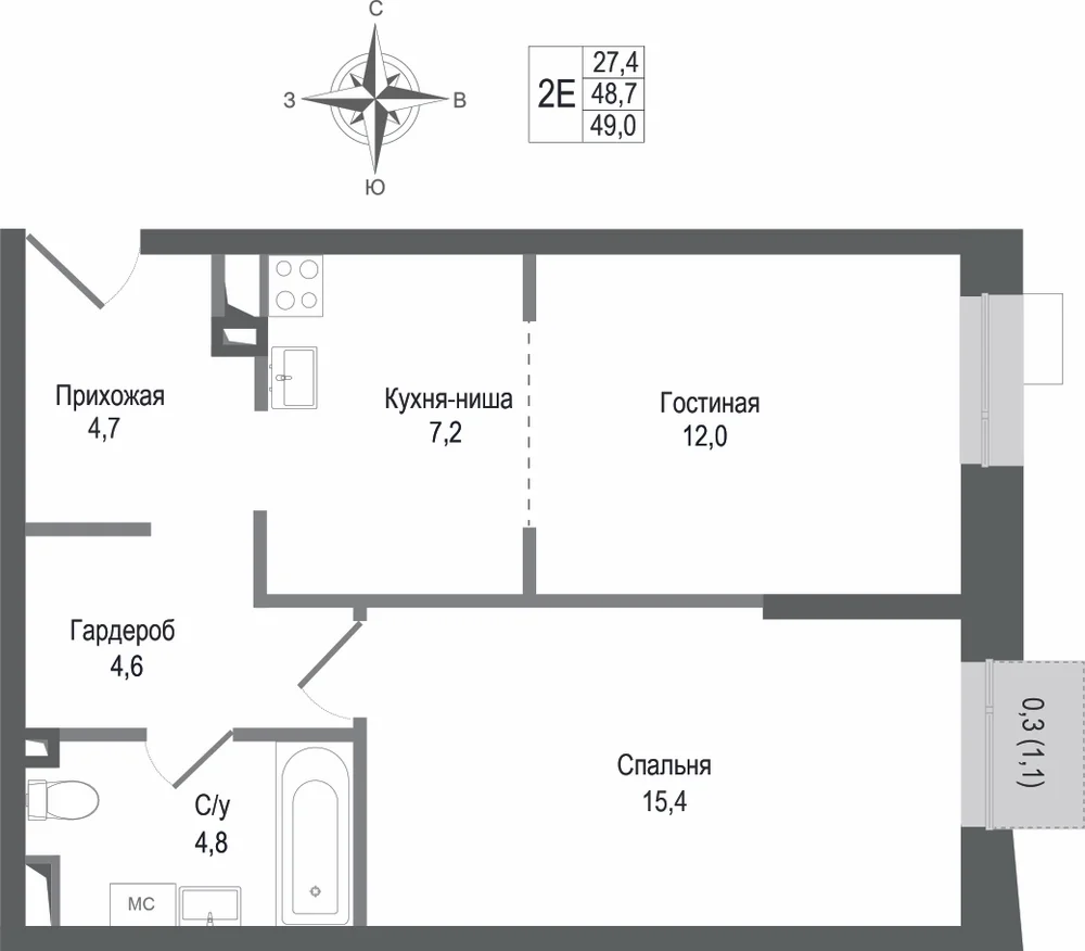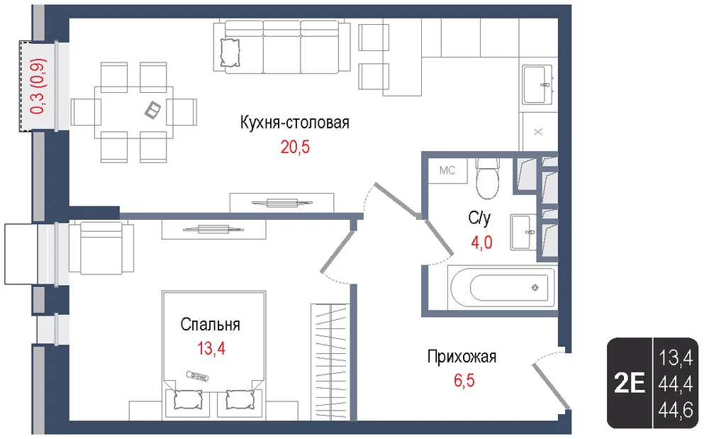 2-комнатная  44.4 м2