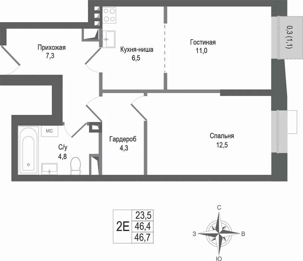 1-комнатная 45.4 м2