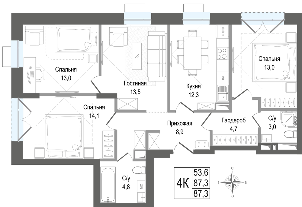 3-комнатная 83.5 м2