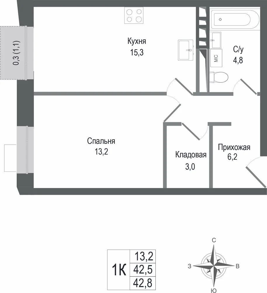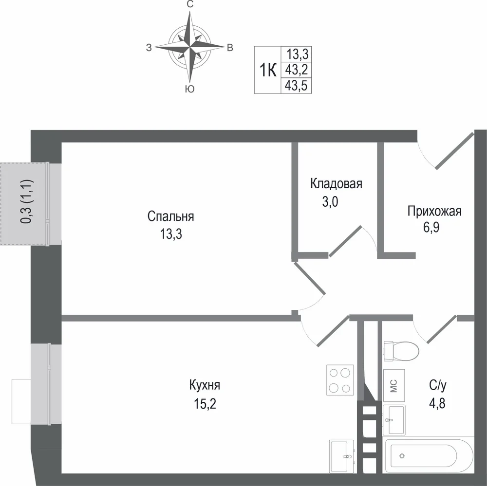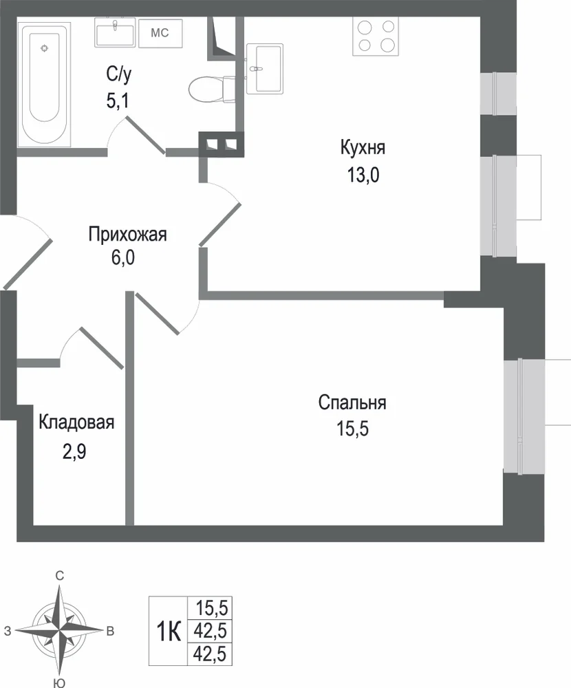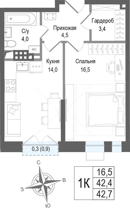 1-комнатная  40.9 м2